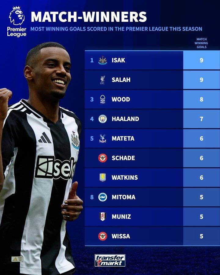 直播吧5月16日讯 德国转会市场统计了本赛季英超打进制胜球最多的球员,伊萨克和萨拉赫并列第一。