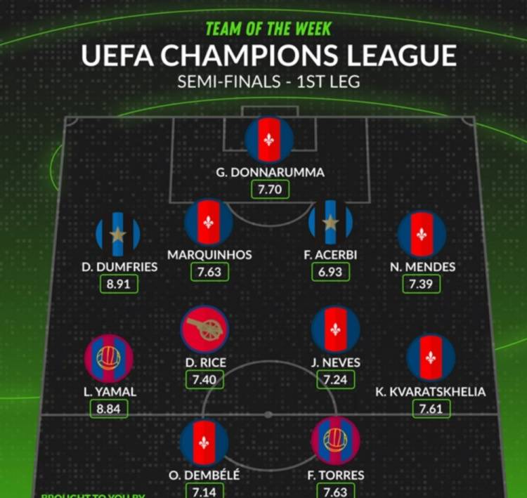 亚马尔领衔!欧冠半决赛最佳阵容,赖斯输球仍入选,大巴黎六人